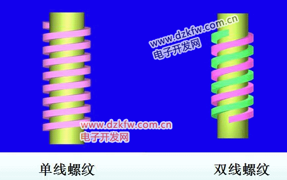 沿一条螺旋线形成的螺纹称为单线螺纹,沿轴向等距分布的两条或两条以上的螺旋线形成的螺纹称为多线螺纹。下图为单线螺纹和双线螺纹的图示。