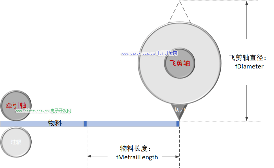 飞剪系统由旋转的刀刃对运动的进给材料按照设定的长度进行剪切,为了提高设备加工效率,要求被剪切材料保持连续进给,而不需在剪切时停顿,是工业生产领域一种常见的控制系统。其控制的难点在于:在被剪切材料高速进给的过程中,剪切刀具能严格与其同步,保证剪切出的板材长度一致。