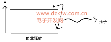 激光介质受到泵激后,其中就包括一批带有激发态电子的原子。受激电子所含能量比低层级电子的能量高。就像电子可以吸收一定能量达到激发态一样,电子也可以释放这种能量。如下图所示,电子只要向低层级跃迁,就会释放部分能量。释放的能量转化为光子(光能)的形式。发射出的光子具有特定的波长(颜色),这取决于释出光子时电子的能量状态。两颗拥有相同电子状态的原子会释放出相同波长的光子。