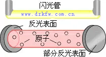 2. 闪光管闪光并将光线射入红宝石棒。光线激发红宝石内的原子。