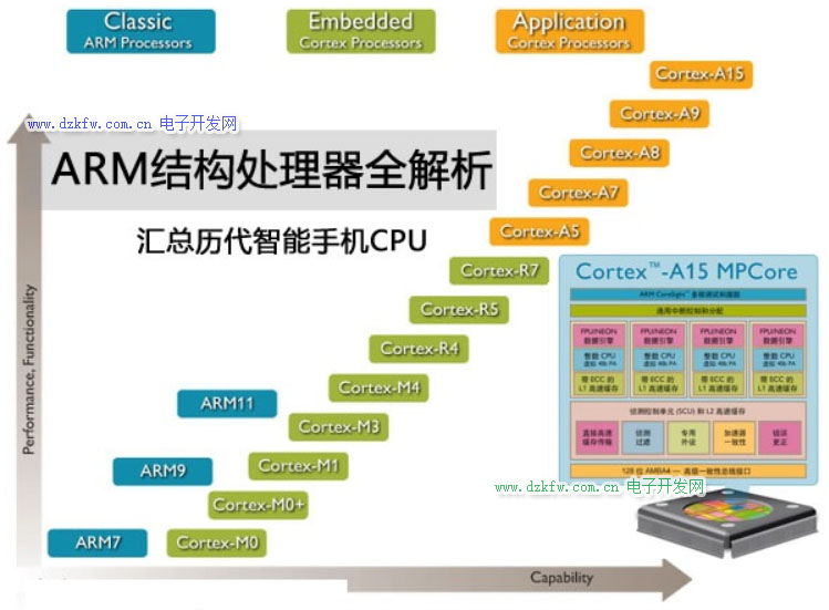 而不需要像单片机开发那样要看芯片数据手册去配置寄存器使用芯片功能。虽然用Arduino开发电子产品效率像开挂一样,不过实际产品却很少用。 因为实际的产品在成本、尺寸、性能、功耗等方面都有特定的要求。 Arduino一般是用于给你学习和提升c语言用的,通过这个平台你可以快速了解c语言是如何控制硬件的。 还有就是一些创客需要快速去实现某些奇特的想法。 所以,如果是走Linux软件方向的,从Arduino入手比较合适,如果你想从事单片机开发偏硬件方向,我建议直接从51单片机入手。 2. arm前面我们把Arduino比作是大众,树莓派是保时捷,那arm就是一个V12发动机。 Arm本身就是一家英国公司名简称(AdvancedRISC Machines),arm也是一种芯片内核技术。 我们单片机一般都是有内核的,比如说51内核,以前因特尔设计的,主要针对一些控制和运算比较简单的电子产品。 还有ARM内核的,主要针对运算和控制比较复杂的电子产品。 Arduino的AVR单片机正好介于这两者之间,比51内核强大,比ARM内核菜。 单纯的内核不能直接应用在产品,需要进行二次开发,所以,ARM公司一般会把这种内核技术卖给半导体公司做二次设计。 一般ARM公司有3种授权级别:① .架构层授权这个级别是指可以对ARM内核架构进行大量改造,包括汇编指令集的扩展和缩减,像苹果就是在ARMV7-A架构基础上,扩展出swift架构。 除了苹果以外,还有海思麒麟、联发科、三星、高通等cpu大多都是ARM架构。 ② .内核层授权这个级别是可以在这个内核基础上可以加自己需要的外设,比如说GPIO、USART、ADC、DMA等等,最后做成自己的单片机。 像STM32就是这样干的,类似的芯片还有巨多,大多数出SOC单片机的都是属于这层。 ③ 使用层授权这个层级权限最低,相当于你只能使用它,不能对它进行修改。 ARM内核也分很多个版本,ARM7、ARM9、ARM11,到了ARM11以后就是以Cortex命名了。