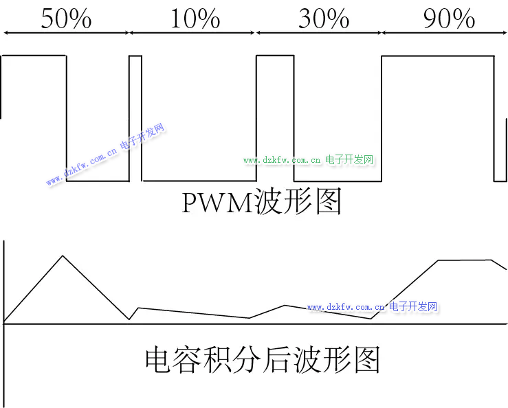 通过调整一个周期里面输出脚高/低电平的时间比(即是占空比)去获得给一个用电器不同的平均功率。
