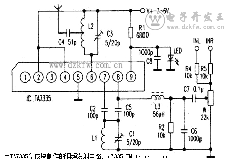 TA7335引脚功能如下:1.脚天线信号输入端;②脚接电源;③脚高放输出外接调谐回路;④脚混频器输入端;⑤脚地;⑥脚混频输出;⑦脚内部振荡器外接 LC回路;⑧、⑨脚间内部有一只变容二极管。当左右两路音频信号经R4、R5混合输入后,由W调节信号大小,经C7、L3送入⑧脚,使⑧、⑨脚内部变容二极管容量随音频信号变化而变化,从而改变⑦脚外接谐振回路的频率,实现了对振荡器载波的频率调制。⑨脚外接元件为内部变容二极管提供稳定电压。LED兼作电源指示。已调谐振荡信号在内部输入到混频器<这里成为放大器,由⑥脚输出,通过天线发射出去。实际制作时,L1、12均用,0.5mm漆包线在圆珠笔心上密绕6匝脱胎而成,其中L2在中间抽头。lj为小电感,亦可用lOk电阻代替。天线用软线、拉杆天线均可。