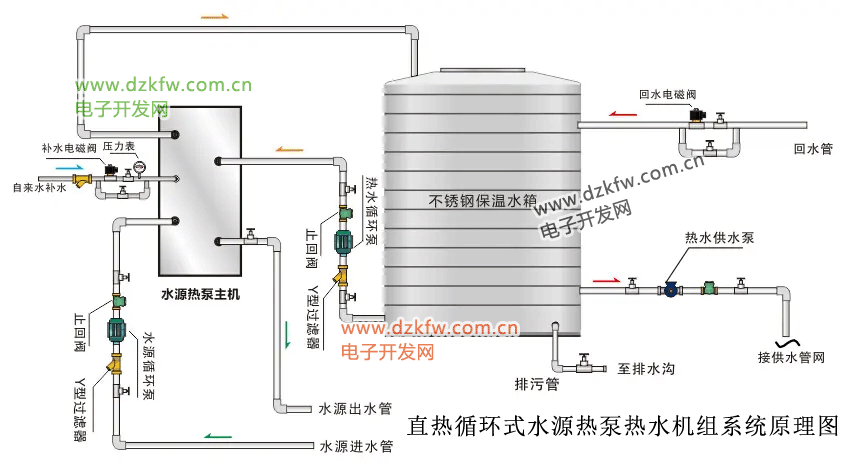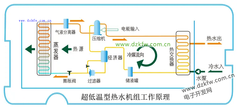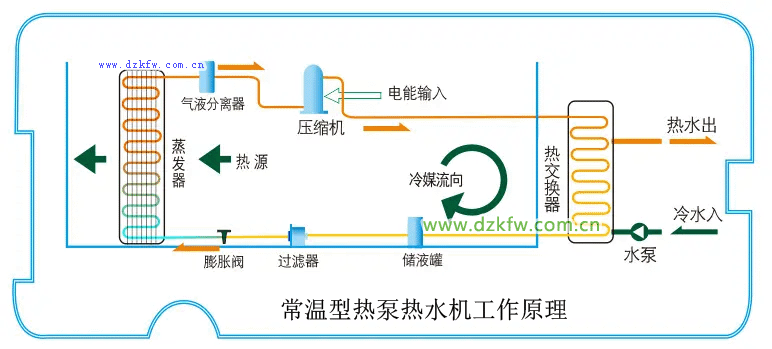 压缩机把低压气态冷媒吸入,转化成为高温高压的气体,并推入冷凝器(即水箱换热盘管),在节流阀的作用之下,高温高压的气体在冷凝器中由气态冷却成液态,同时释放大量能量。释放的能量进入水箱中,把水加热起来了。释放掉能量并变成液态的冷媒经节流阀流入蒸发器(即空气换热器),压力瞬间降低,液态的冷媒在低压环境下又蒸发成气态,此时吸收大量的热量。吸收热量变成气态的低压冷媒被吸入压缩机,进入下一个循环。